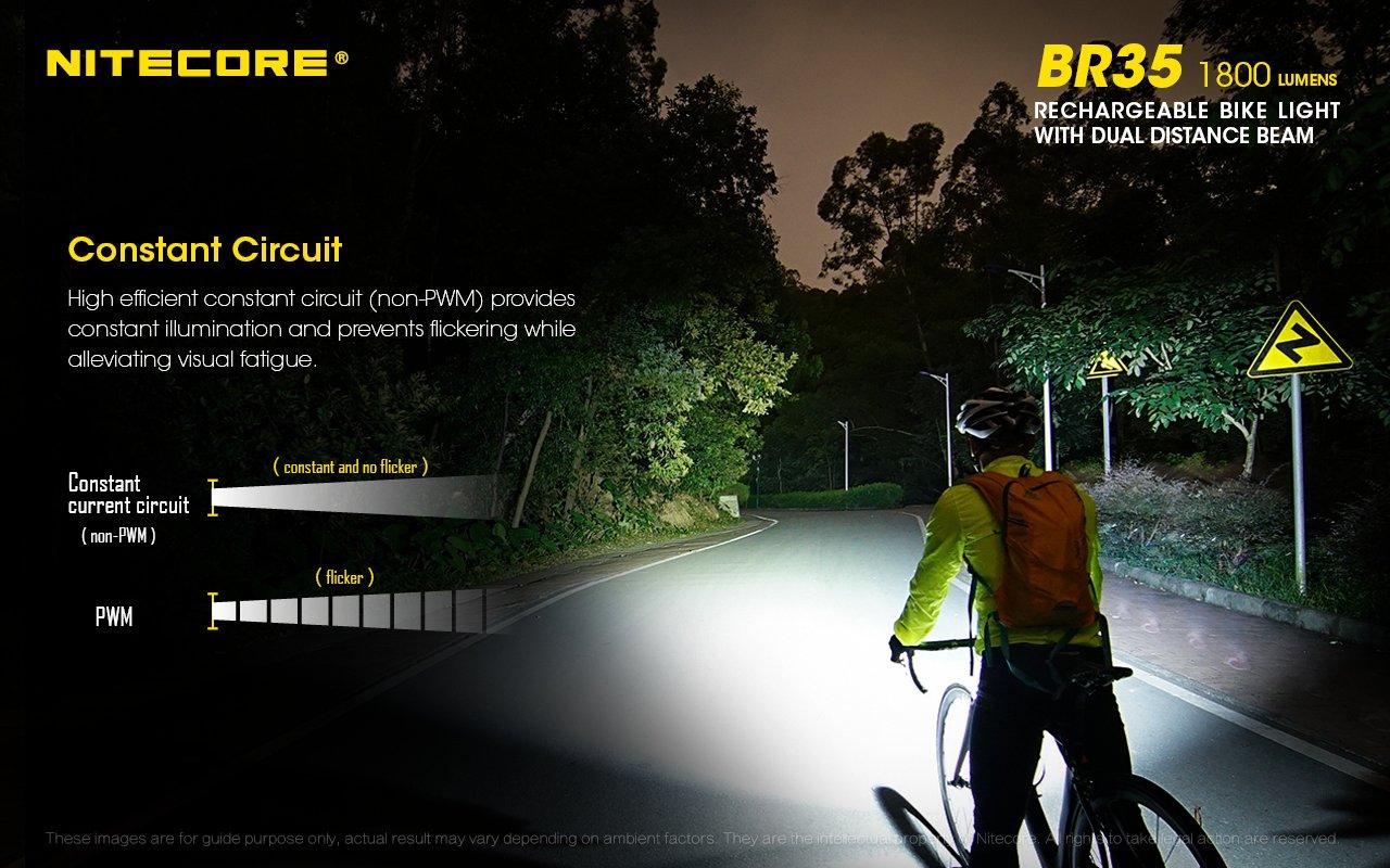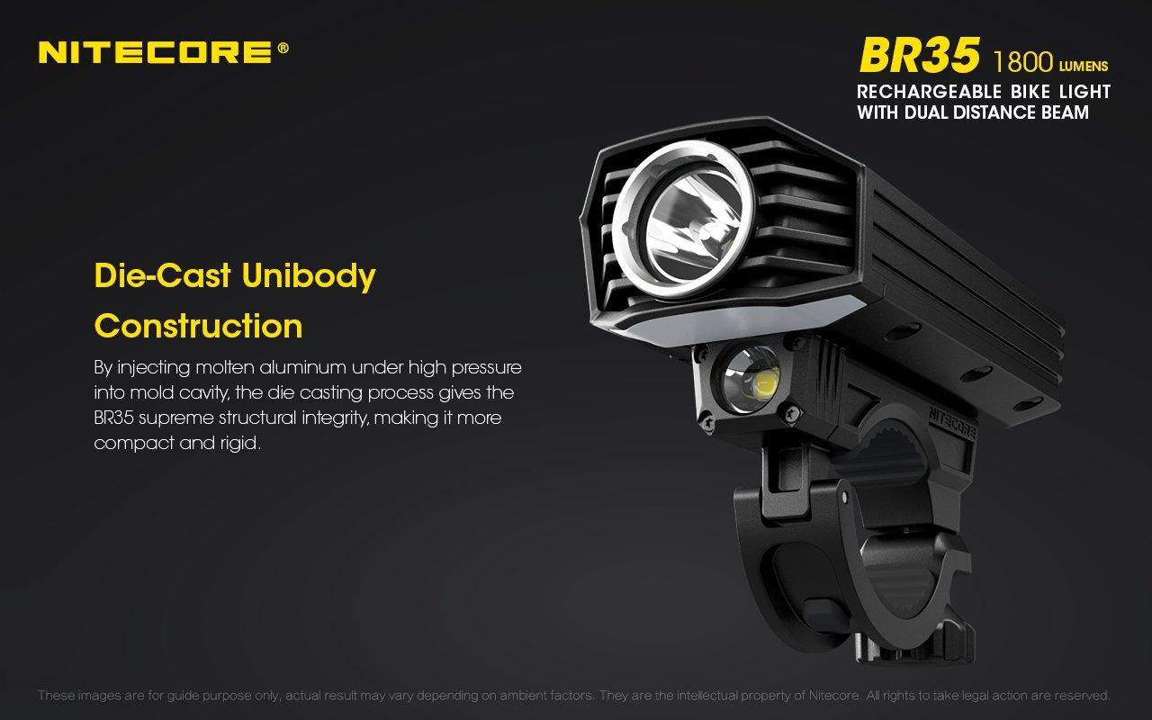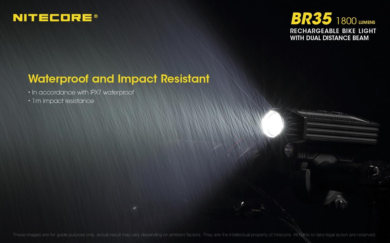 Built of sturdy, heat-shedding die-cast aluminum, the BR35 features Advanced Temperature Regulation circuitry, overcharge and over-discharge protection, constant circuit (non-PWM) anti-flicker design, and an optic lens with anti-reflective coating and a Precision Digital Optics Technology (PDOT) reflector. It carries an IPX7 water-resistance rating, so rain is no cause for concern, and is rated impact-resistant to 1.5m.